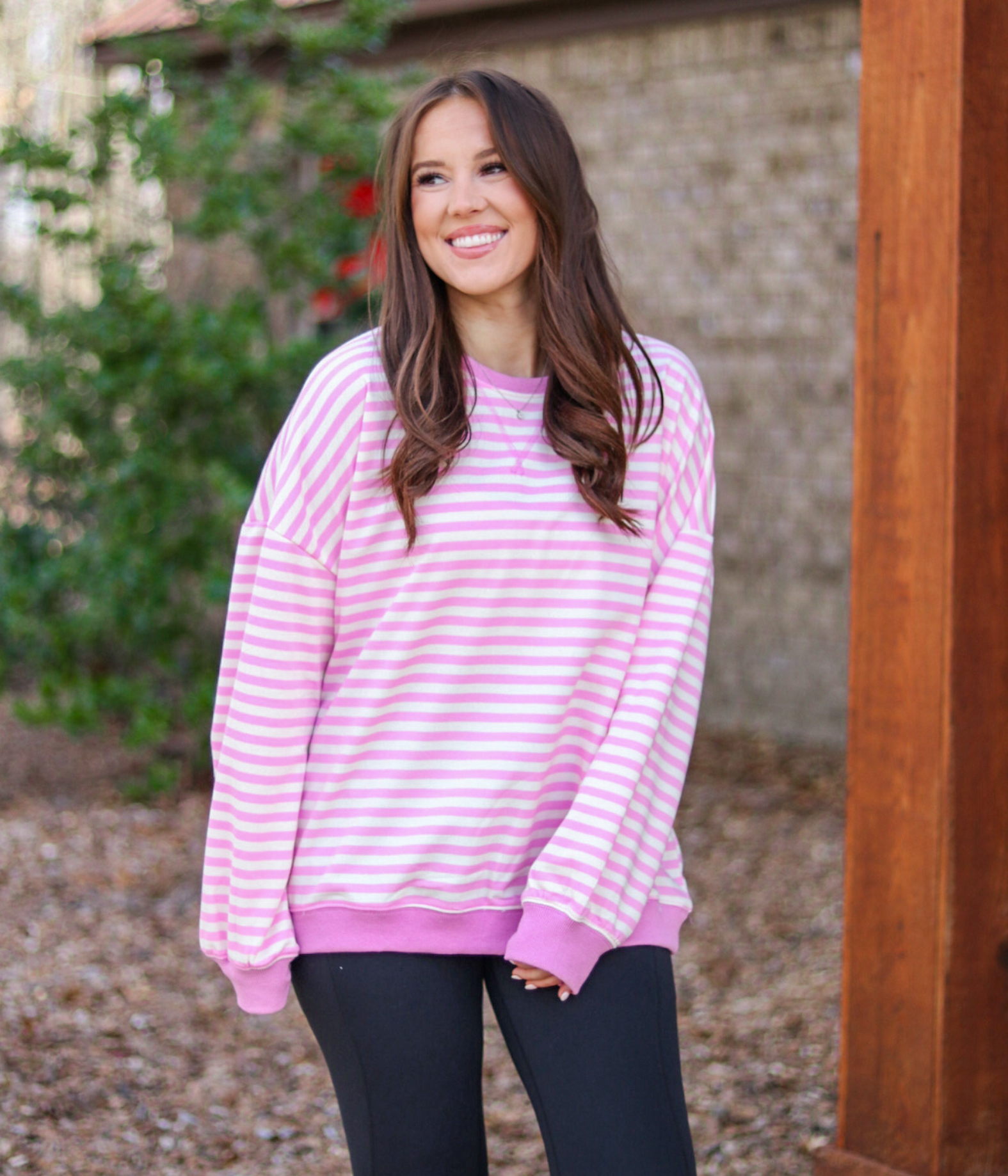 Embrace effortless style with this charming pink stripe pullover—your new go-to for laid-back vibes and cozy comfort. The classic striped pattern adds a playful touch to any casual outfit, while the relaxed fit keeps you feeling free and easy. Perfect for weekend hangouts, coffee runs, or those days when comfort is non-negotiable.